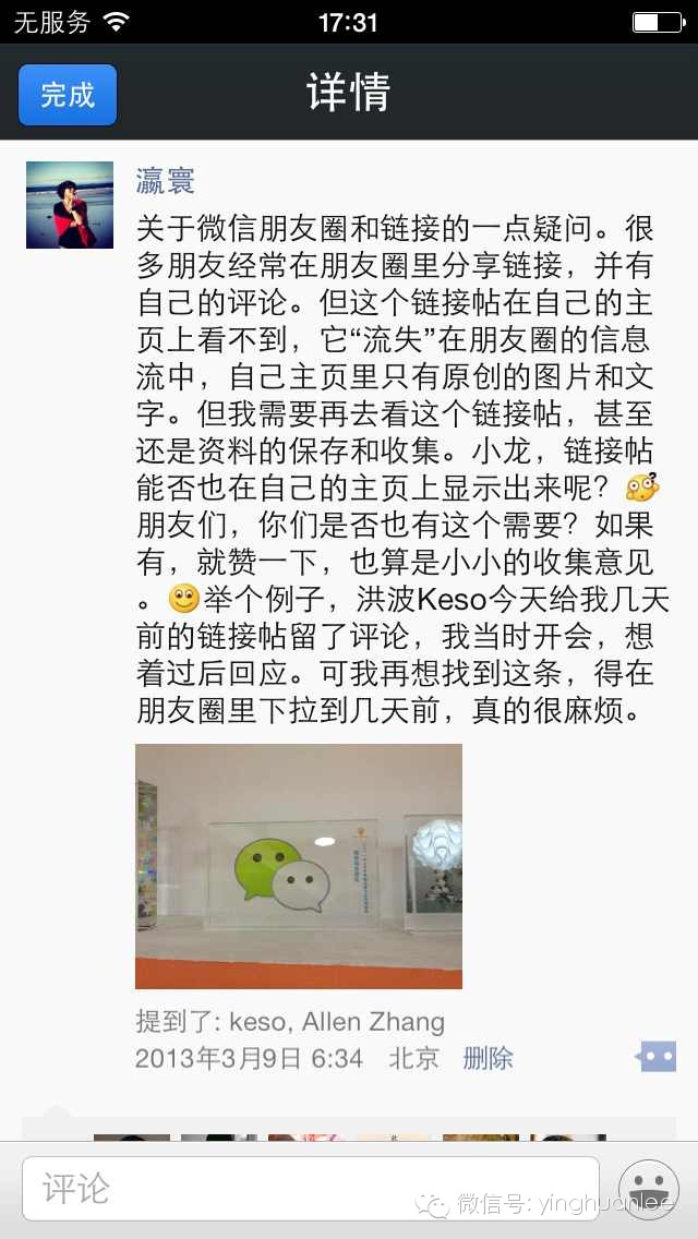 去年3月,我在朋友圈发了一个贴子并提醒小龙来看,贴子如下:“关于微信朋友圈和链接的一点疑问。很多朋友经常在朋友圈里分享链接,并有自己的评论。但这个链接帖在自己的主页上看不到,它“流失”在朋友圈的信息流中,自己主页里只有原创的图片和文字。但我需要再去看这个链接帖,甚至还是资料的保存和收集。小龙,链接帖能否也在自己的主页上显示出来呢?朋友们,你们是否也有这个需要?如果有,就赞一下,也算是小小的收集意见。。。。”
